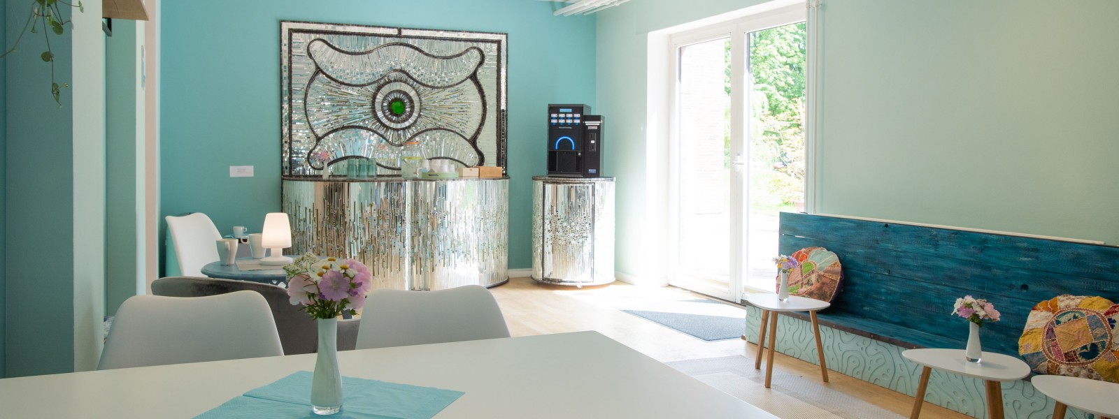 Die beiden in Nordfriesland ansässigen Künstler Hilke thor Straten und Morten Keese haben mit ihren faszinierenden Mosaik- und Stahlarbeiten dem kleinen Selbstbedienungscafé den besonderen Rahmen gegeben. Mit viel Kreativität und Liebe ist ein Raum geschaffen worden, der die Gäste des Museums und der Stadtbibliothek zu einer inspirierenden Kaffeepause einlädt. Angeboten werden hier Wasser sowie Kaffeespezialitäten und Tee (alles aus fairem Handel).